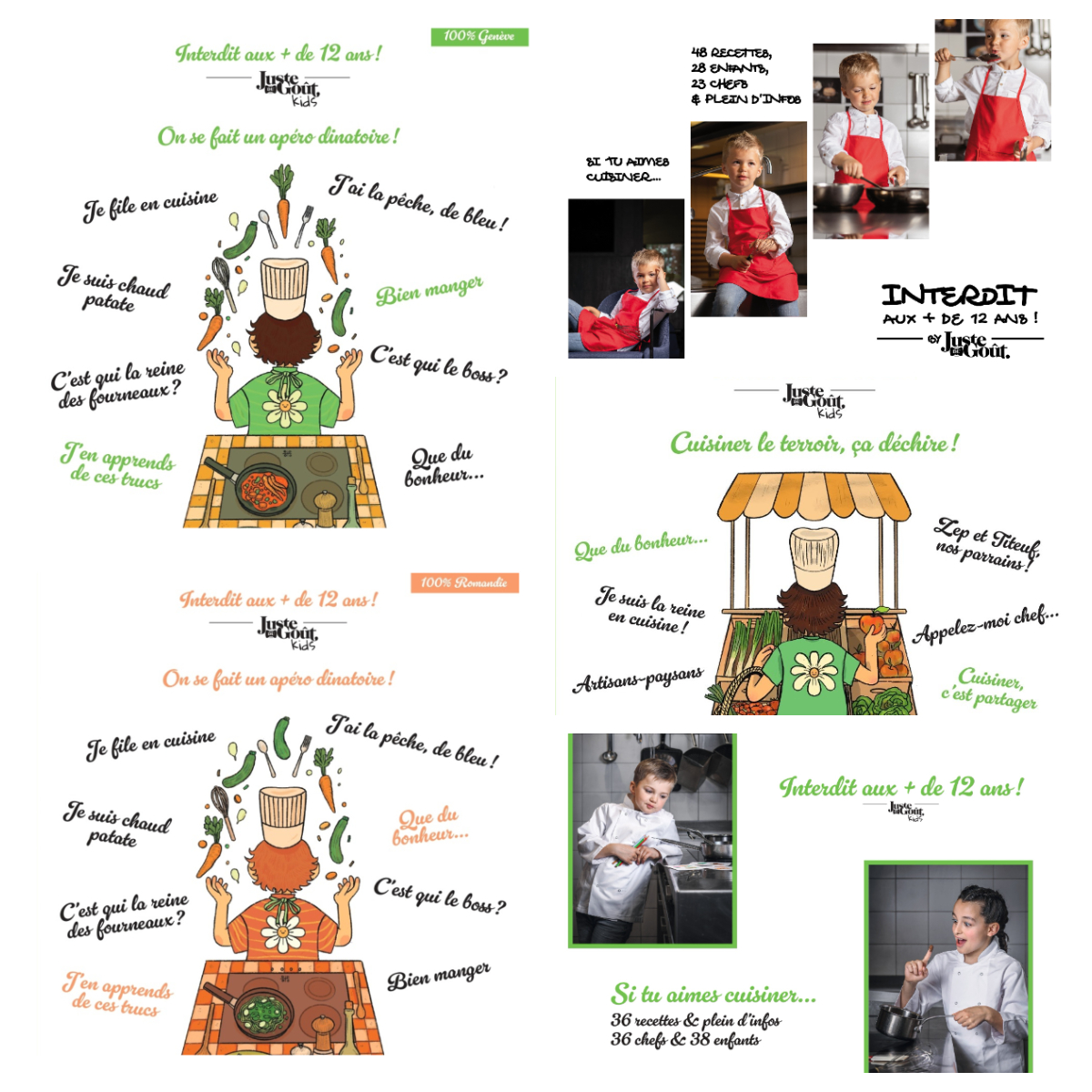 « Interdit aux + de 12 ans ! » : édition 2021, édition 2023, les deux opus 2024 : On se fait un apéro dînatoire 100% Genève et 100% Romandie, le dernier né : Cuisiner le terroir, ça déchire 100% Genève + en cadeau pour les grands, « Cuisine du monde », la totale !