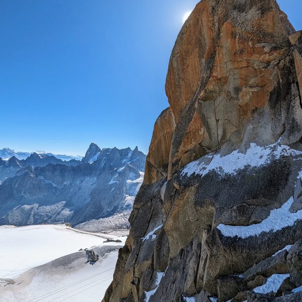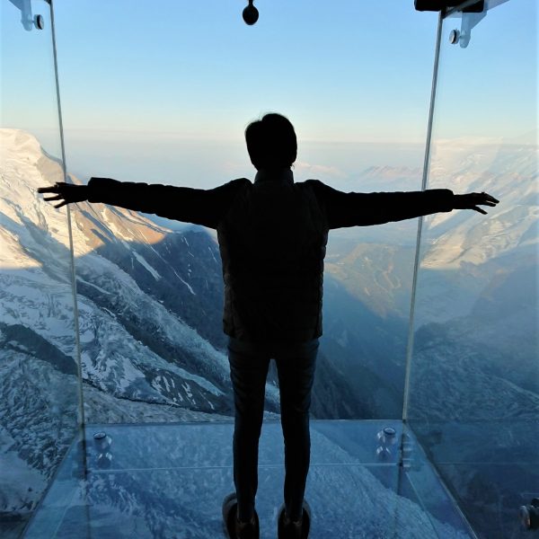 Raison de cette escapade : la première fois en 2019, j’ai réalisé un rêve en y allant et pourtant je vis à côté du Mont-Blanc mais voilà j’ai une trouille bleue des téléphériques ! Je l’ai surpassée pour atteindre 3842m et pour voir d’en-haut des paysages et des sommets que je connais depuis que je suis née, ce n’est pas d’hier ! Si tu aimes la haute-montagne, c’est magique, je te promets.